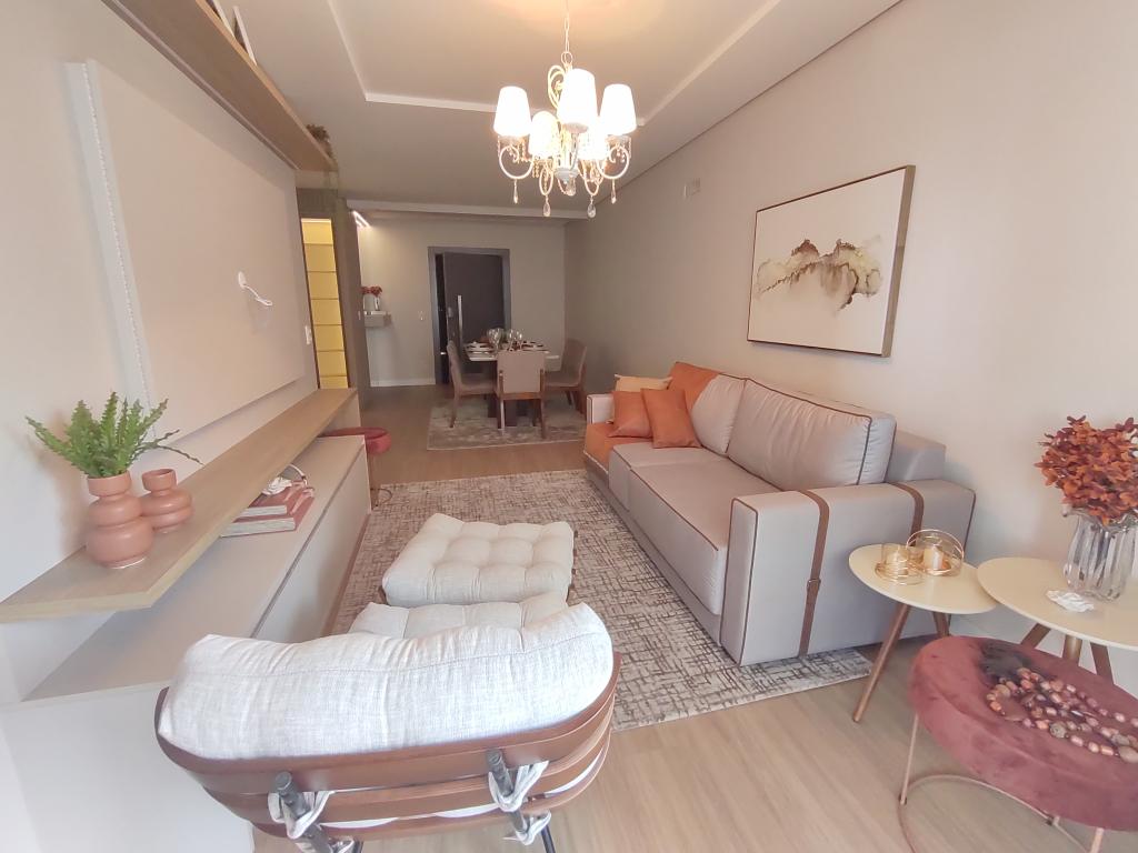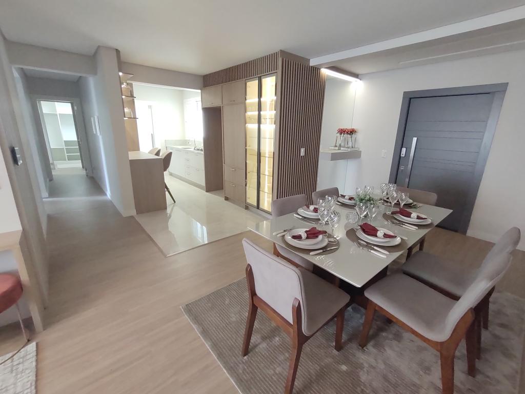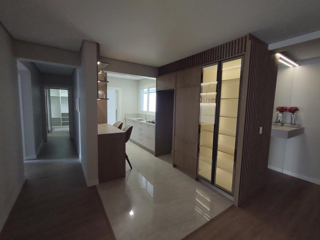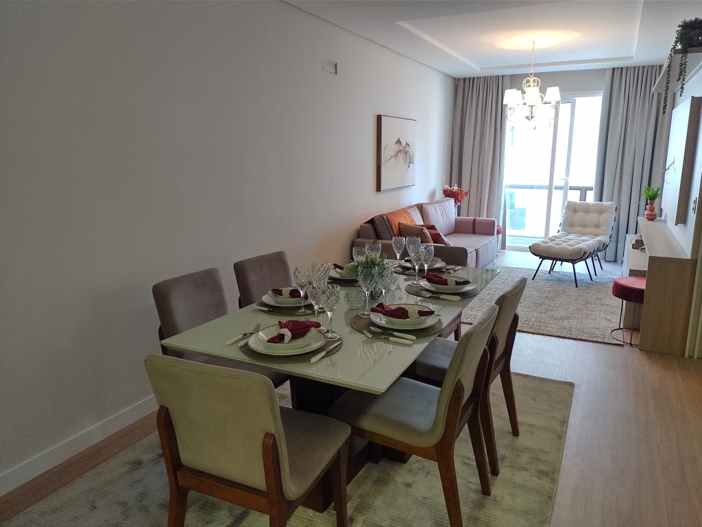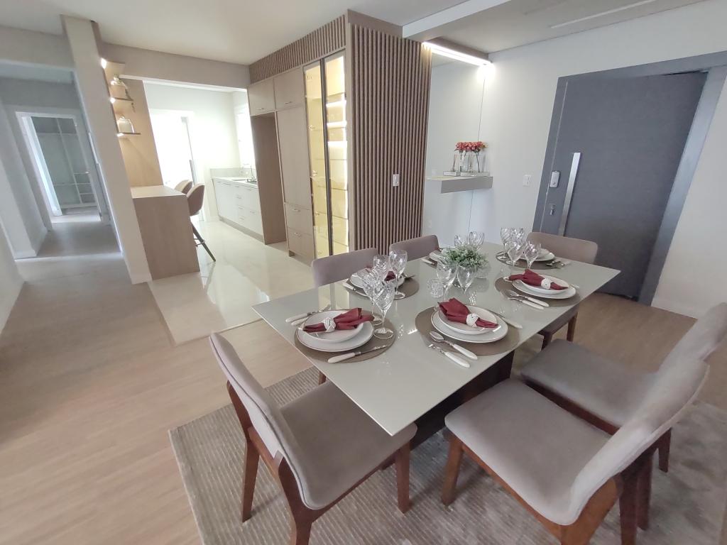 São três dormitórios, sendo um deles suíte, cozinha, lavanderia, sala de estar/jantar, duas varandas, uma com churrasqueira e box duplo.