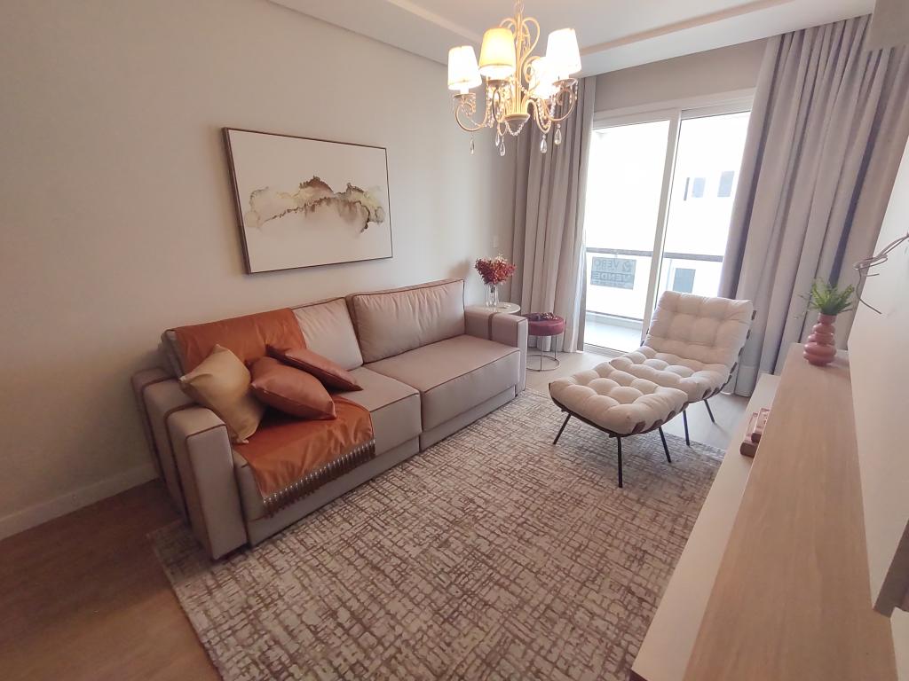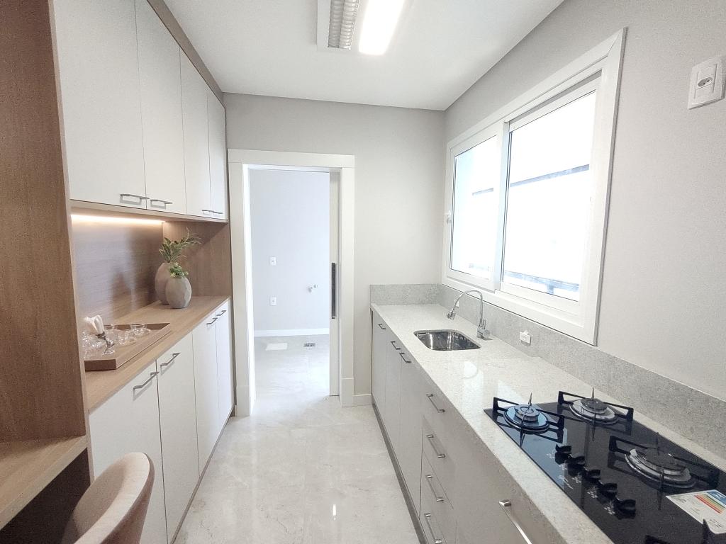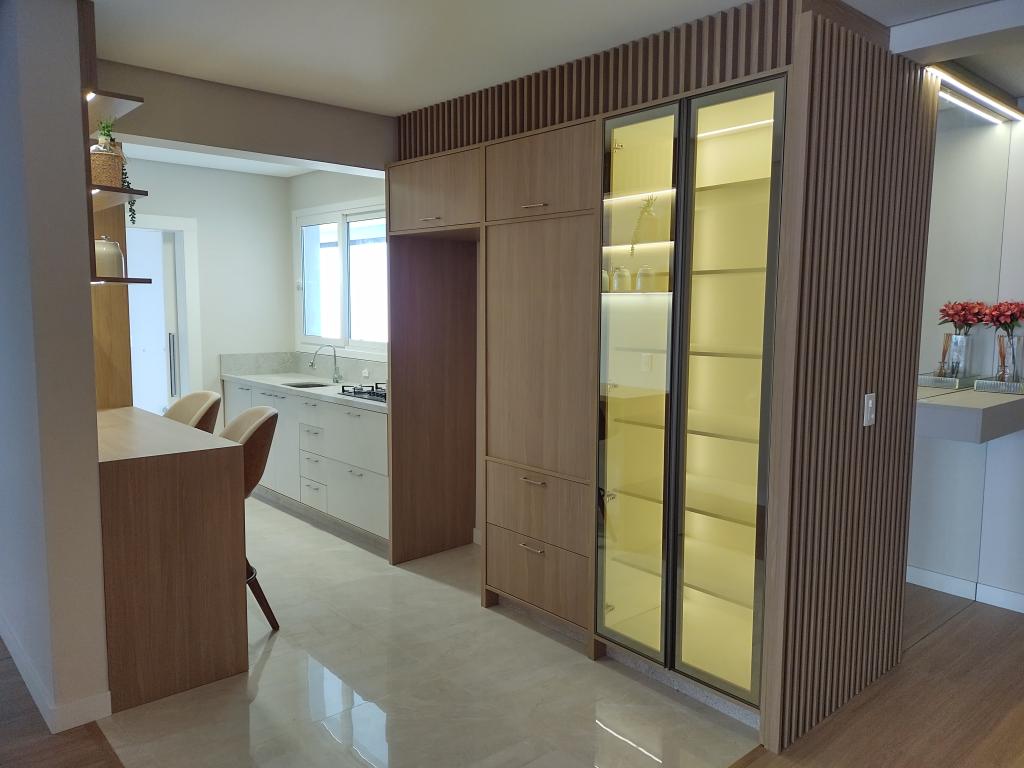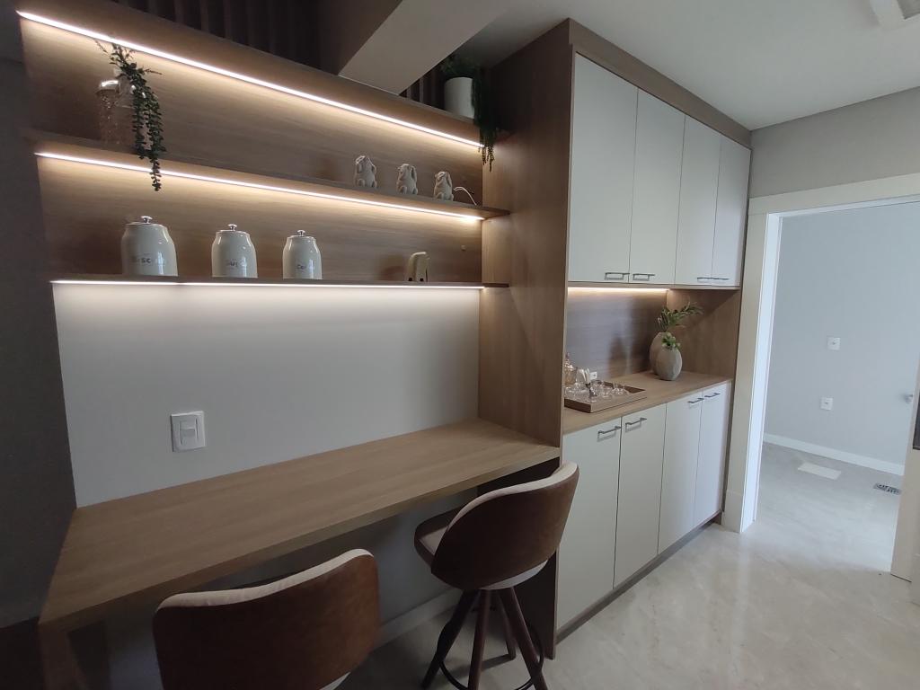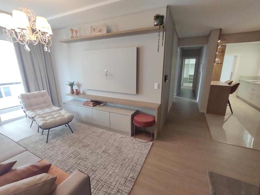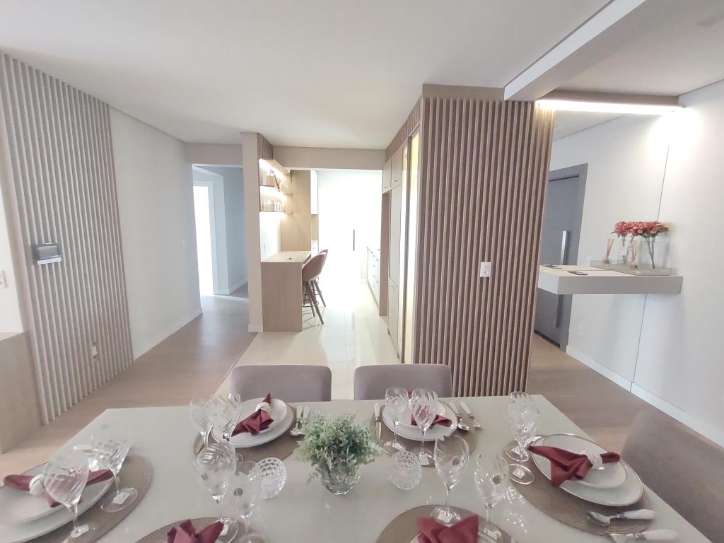 São três dormitórios, sendo um deles suíte, cozinha, lavanderia, sala de estar/jantar, duas varandas, uma com churrasqueira e box duplo.