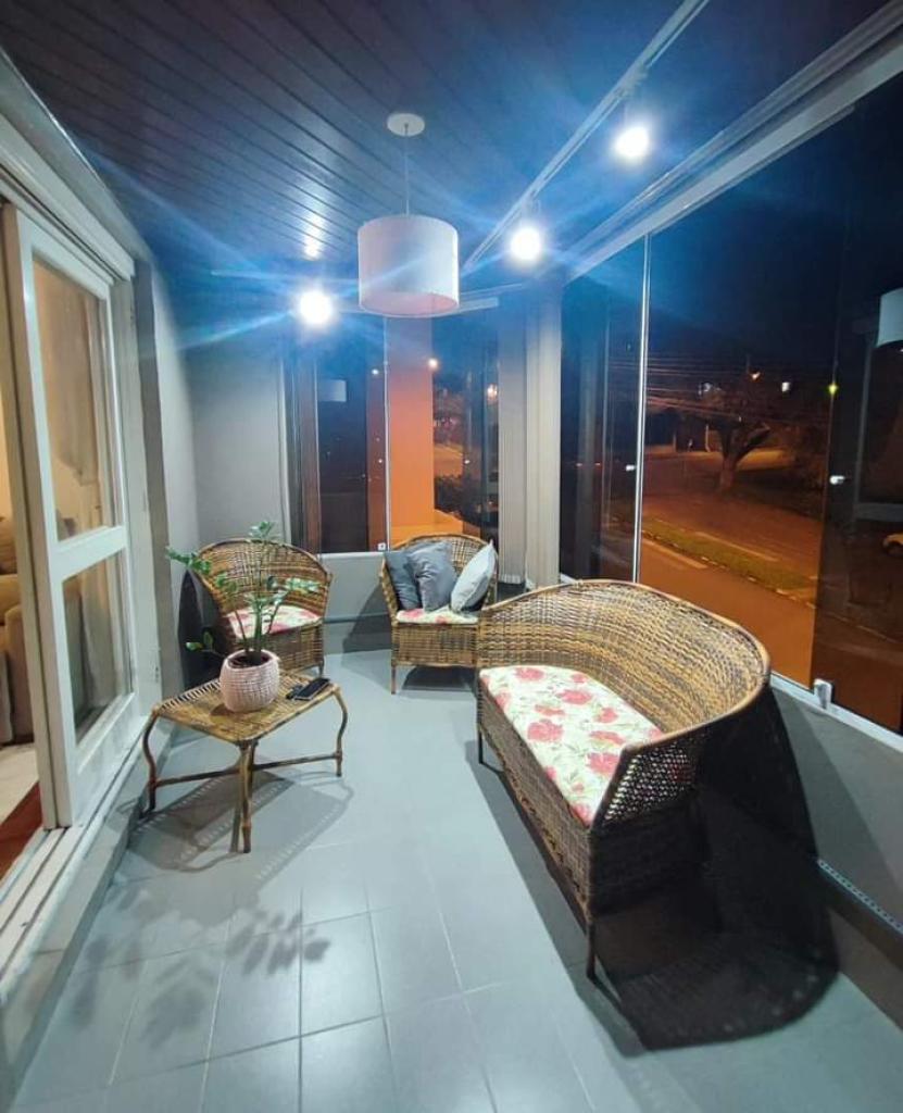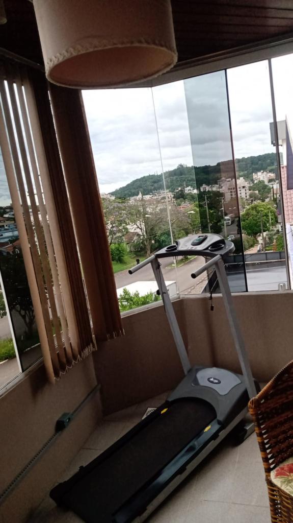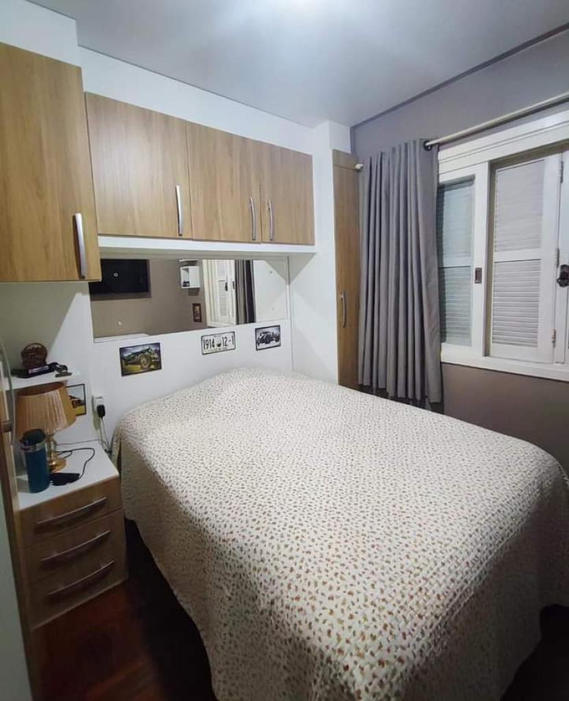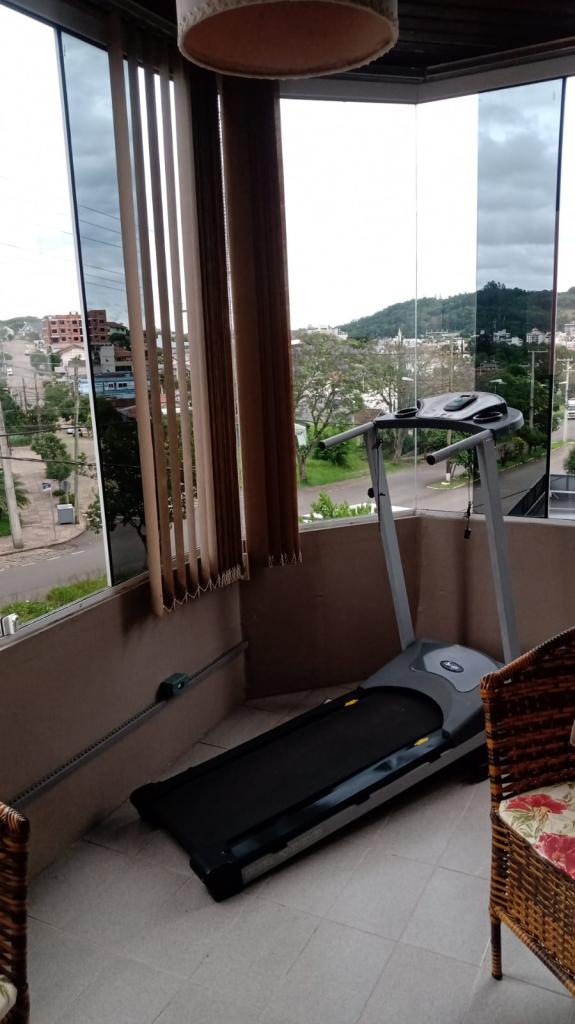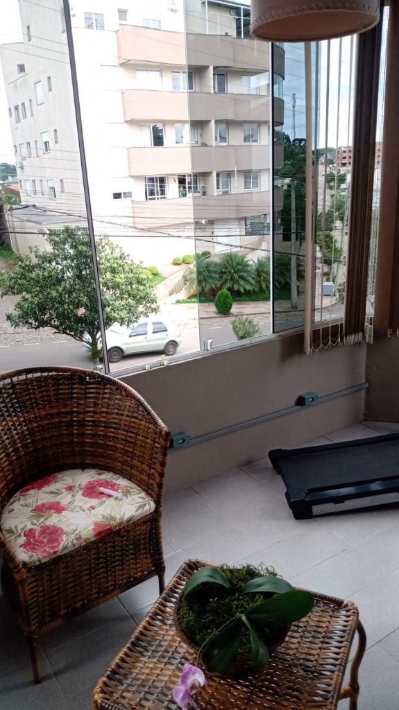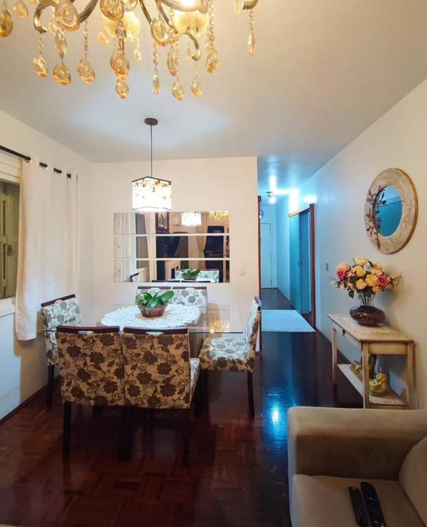 Apartamento com três dormitórios, sendo um deles suíte, dois banheiro, cozinha, área de serviço individual, sacada fechada em vidros, sala de estar e jantar com lareira e ar condicionado. Uma vaga de garagem.
