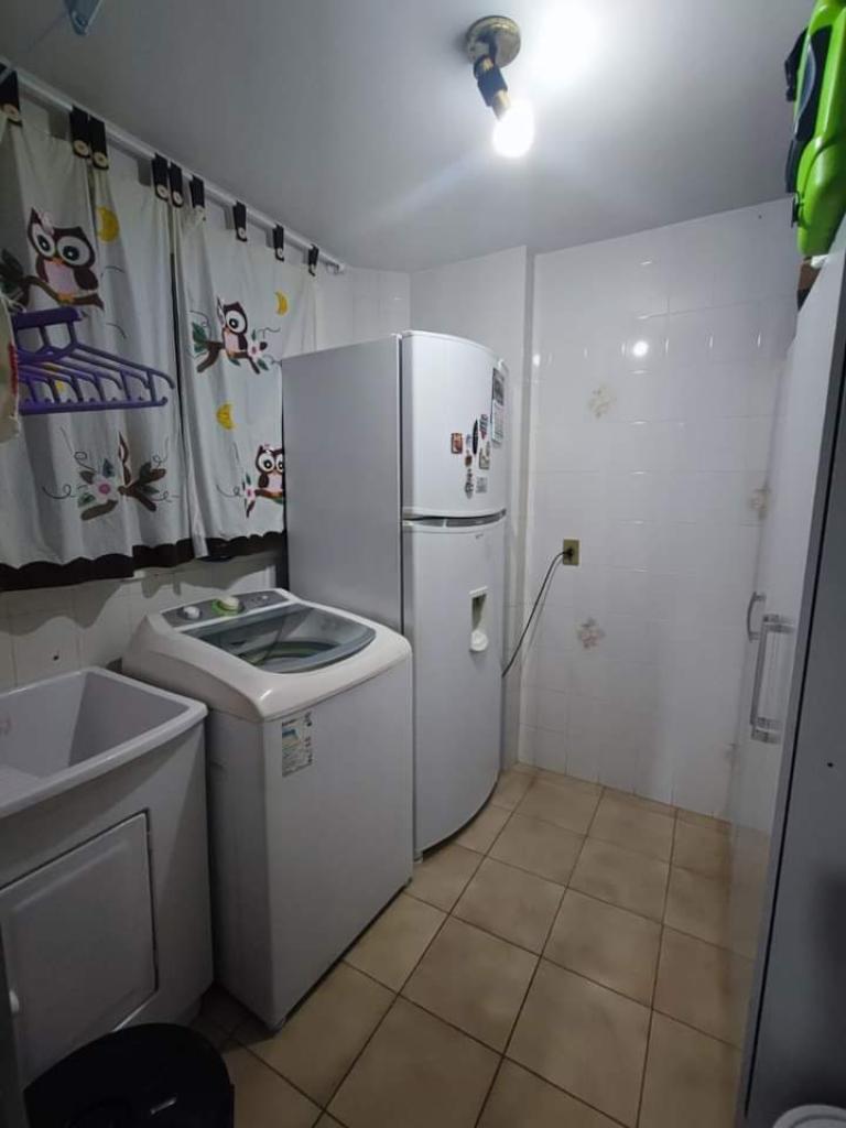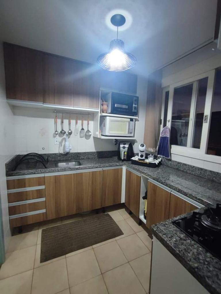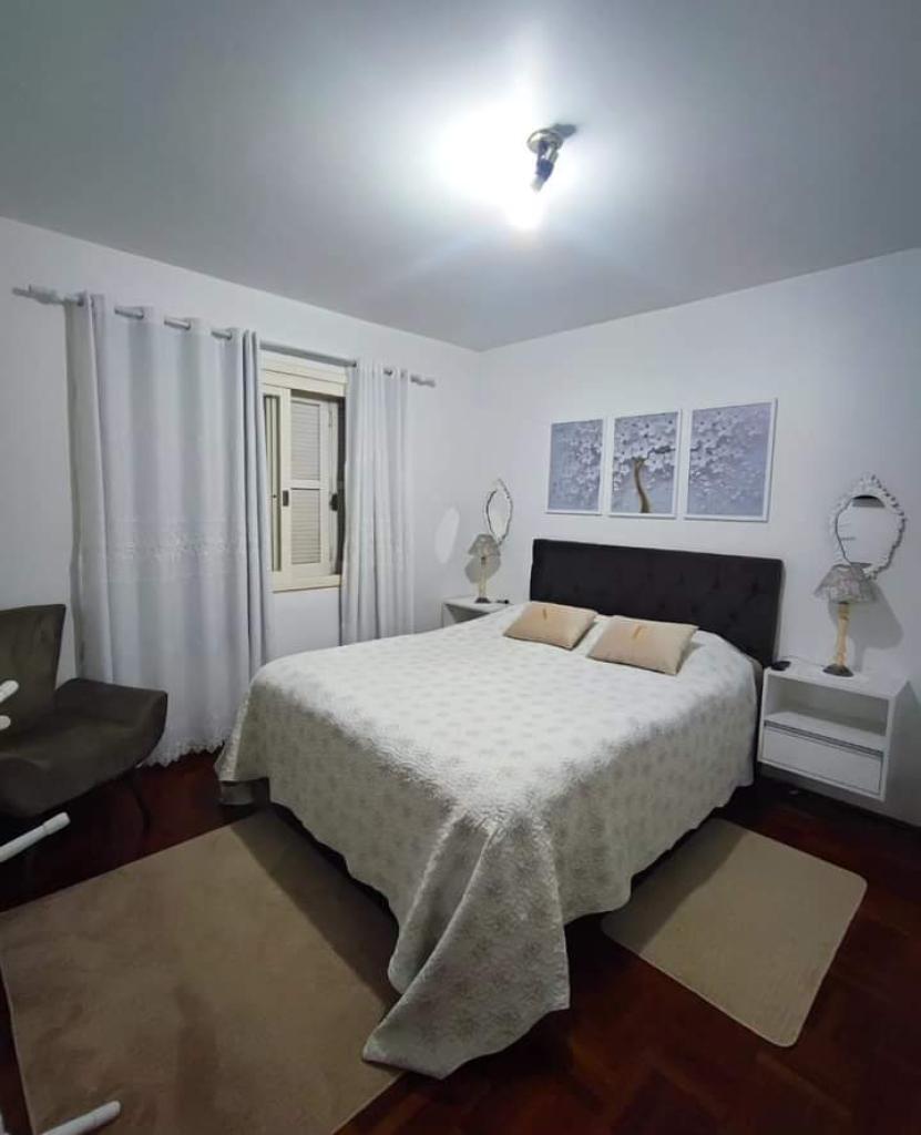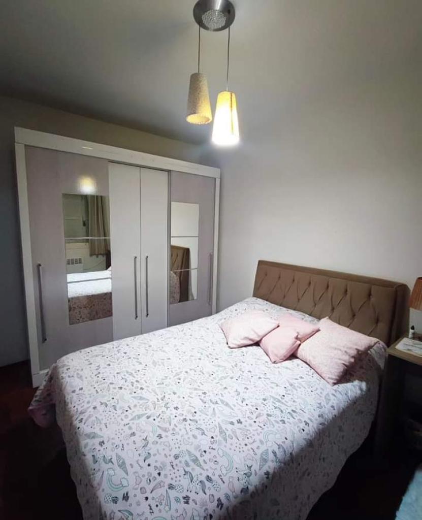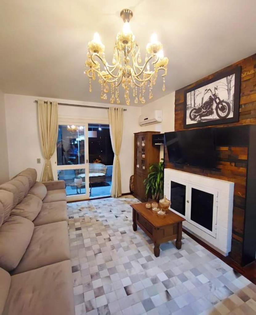 Apartamento com três dormitórios, sendo um deles suíte, dois banheiro, cozinha, área de serviço individual, sacada fechada em vidros, sala de estar e jantar com lareira e ar condicionado. Uma vaga de garagem.